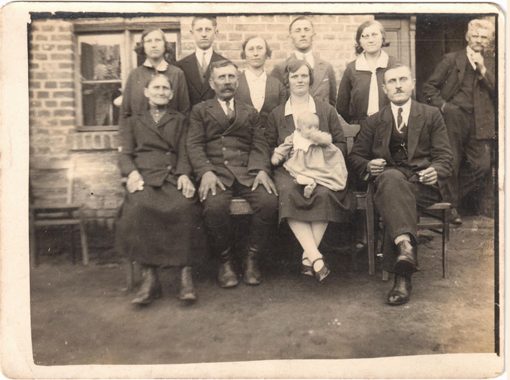 4. Fotografia z wesela Jadwigi Hudziak i Czesława Gałki przed domem na tzw. Trynce (w sąsiedztwie mostu kolejowego od strony wronieckiego Zamościa). Pierwsza od lewej stoi Jagusia. 5 czerwiec 1943 r. Udostępniła H. Kałużyńska